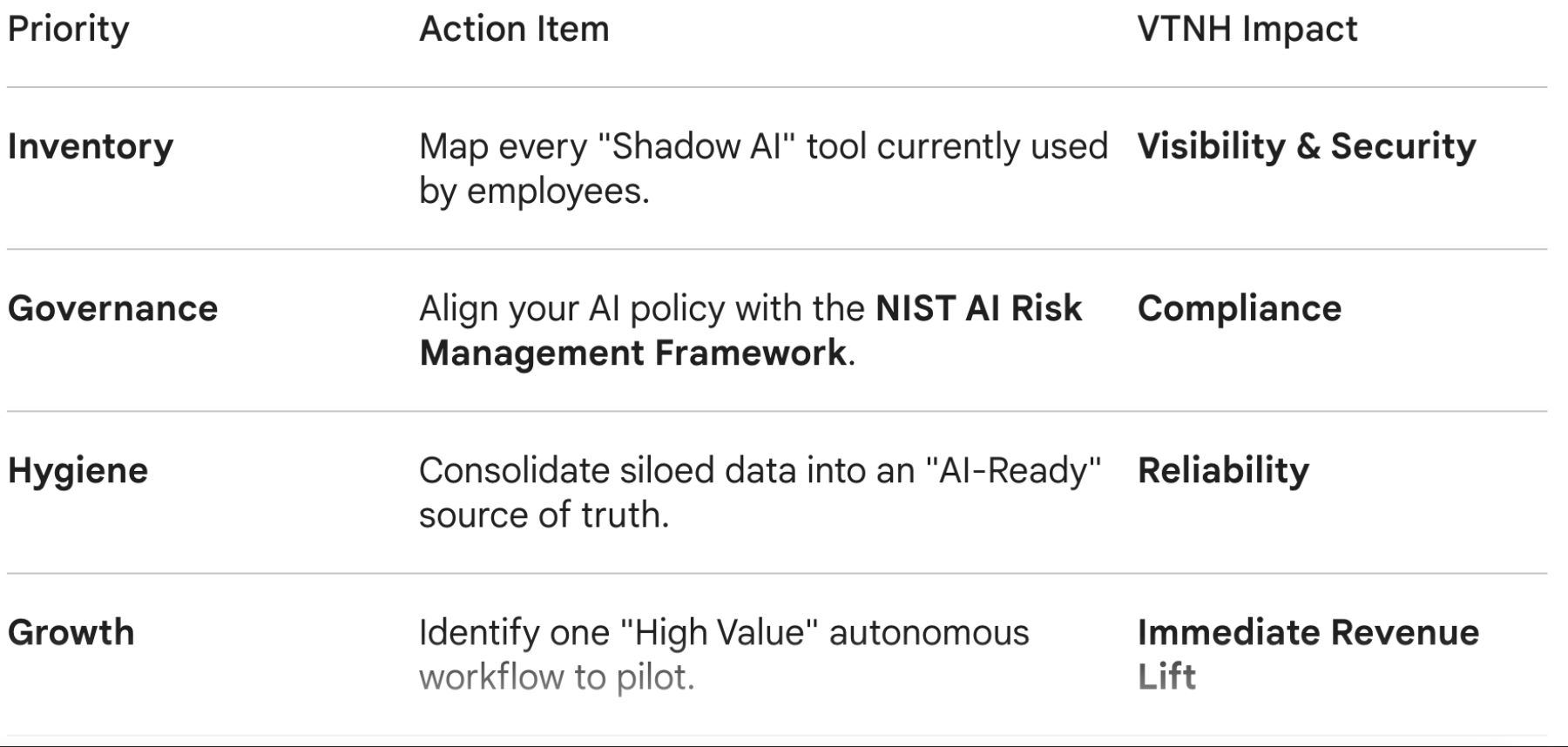 - The VTNH Strategy: We help you implement a "Review Gate"—a structured process where we triage every AI use case for risk and ROI before a single dollar is spent on implementation. Explore our Strategy Services here.